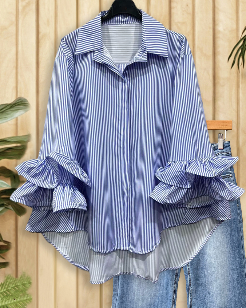 On-trend striped blouse with ruffle sleeves and button-down front.