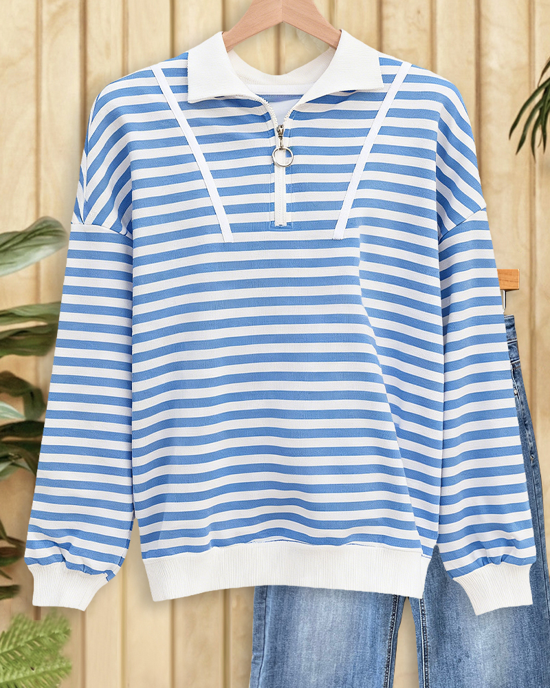 Sporty drop-shoulder sweatshirt with striped zipper design, perfect for casual and active wear.