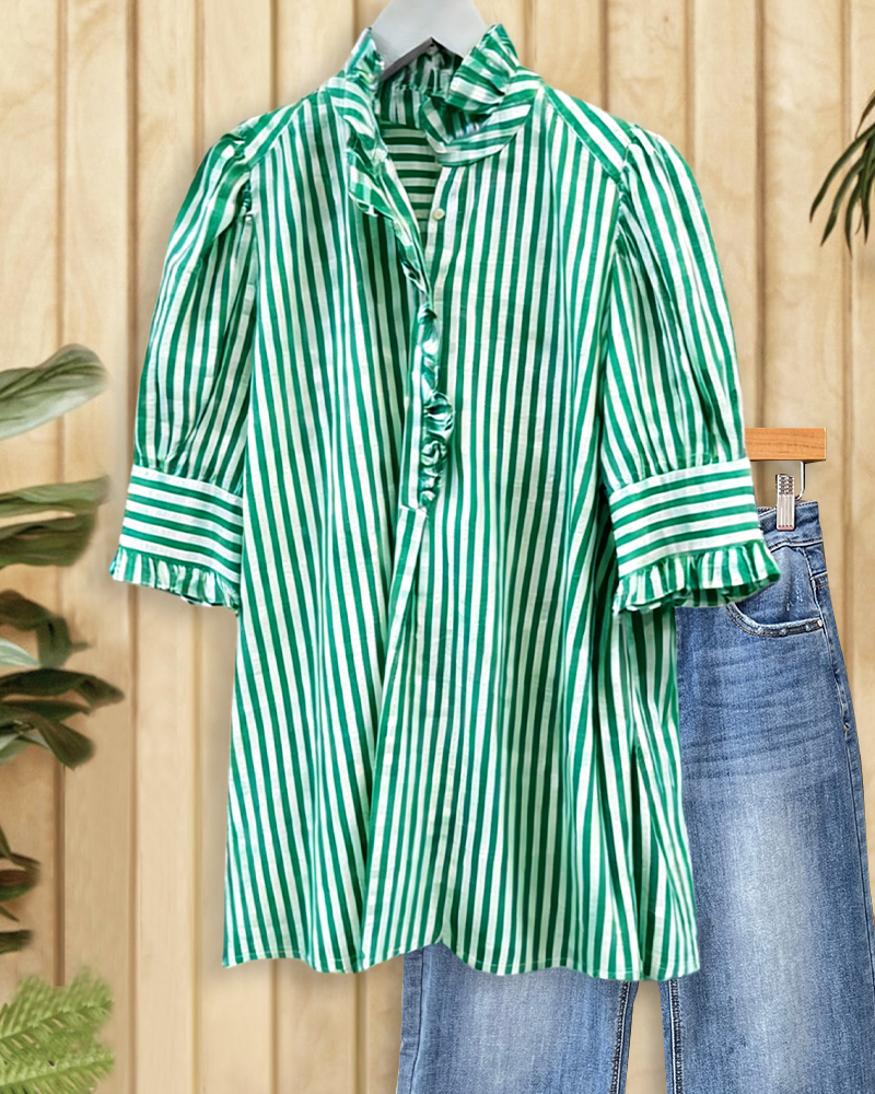 Mint Boutique Striped Stylish Puff Sleeve Ruffles Trim Blouse