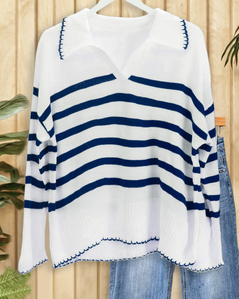 Casual striped V neck sweater with drop-shoulder design, perfect for commuting or daily wear.