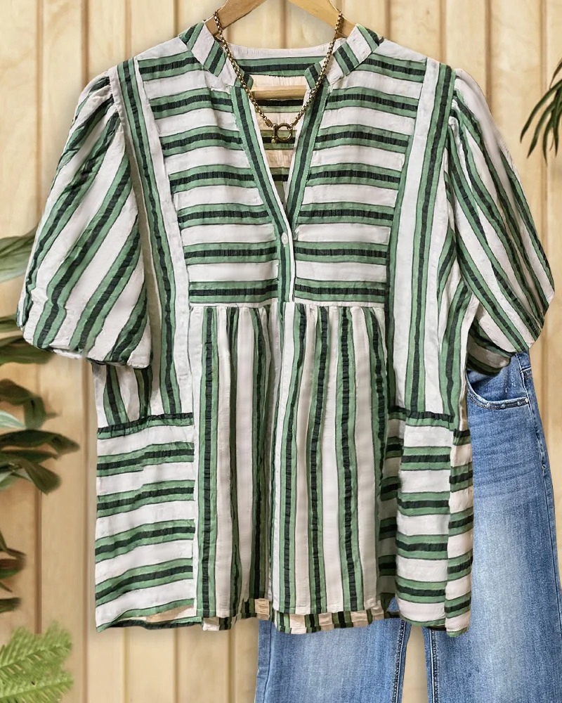 A simple striped V-neck tee with puff sleeves, perfect for effortless everyday style.