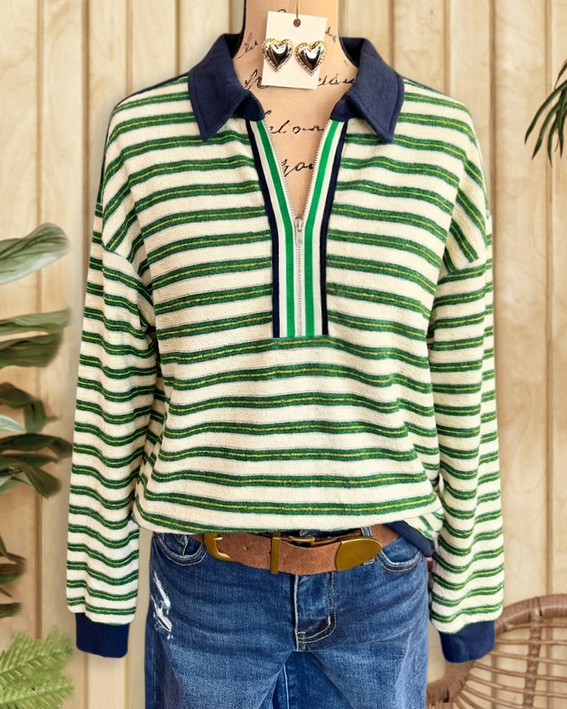 Striped drop-shoulder sweatshirt with zipper, ideal for commuting and casual daily wear.