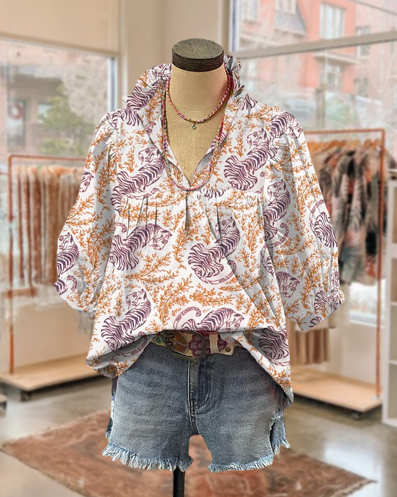 Perfect for bold, stylish looks with tiger and leaf prints on a V-neck blouse.