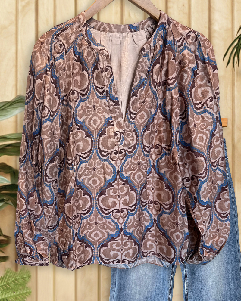 Tribal print blouse with split neck, ideal for boho and ethnic-inspired outfits.