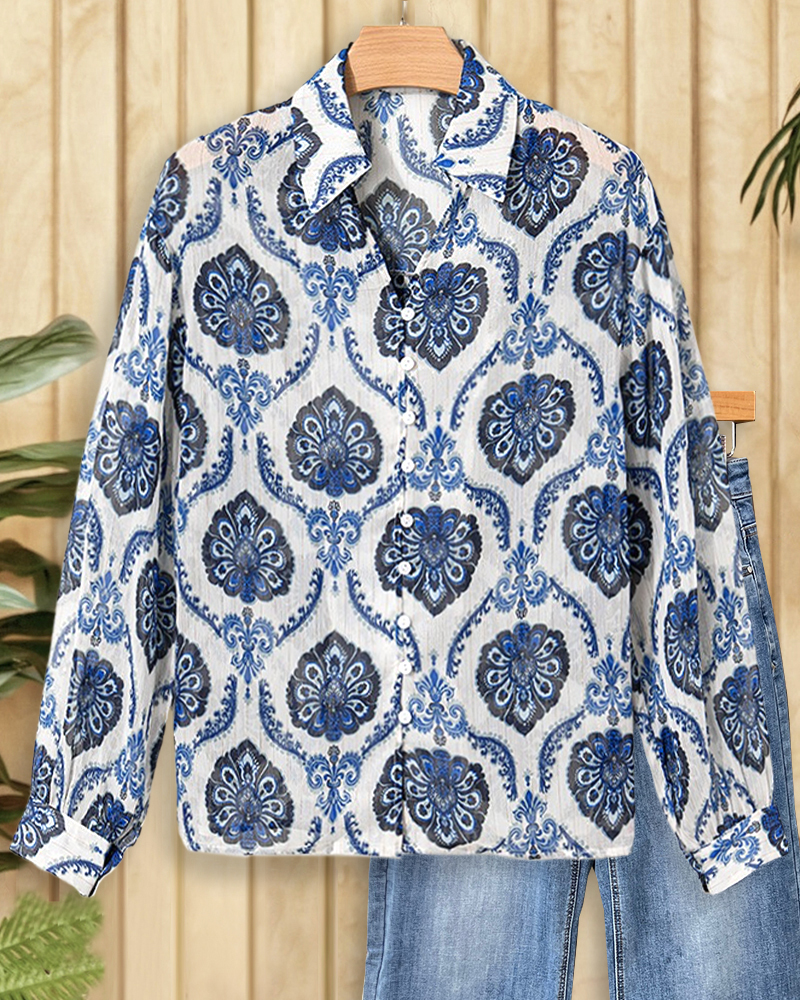 Tribal print shirt with V neck and button front, perfect for casual and ethnic-inspired looks.