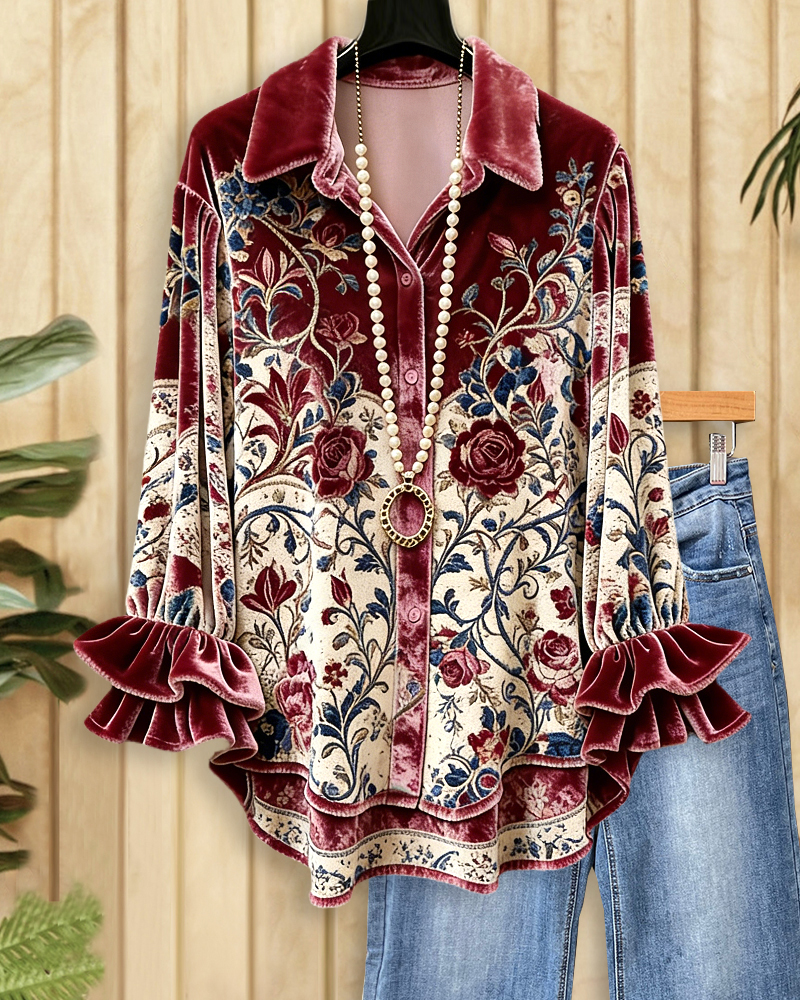 Mint Boutique Velvet Floral Print Retro Ruffle Sleeve Button Up Blouse