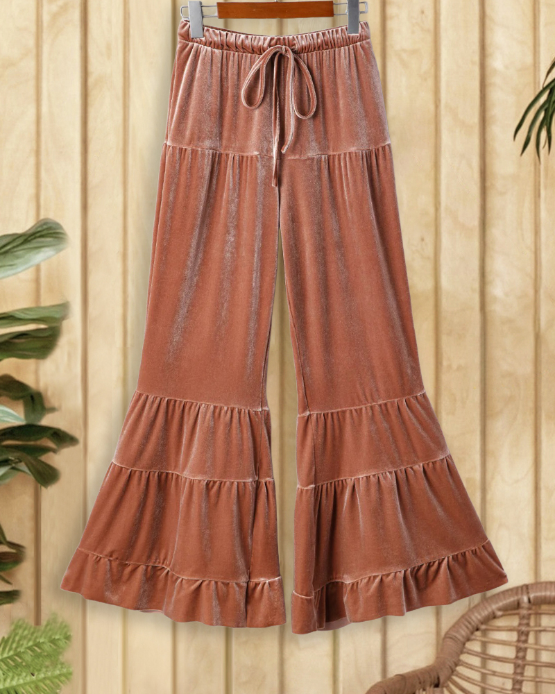 Rocking flared pants in velvet solid color with ruffle details, perfect for stylish casual or evening wear.