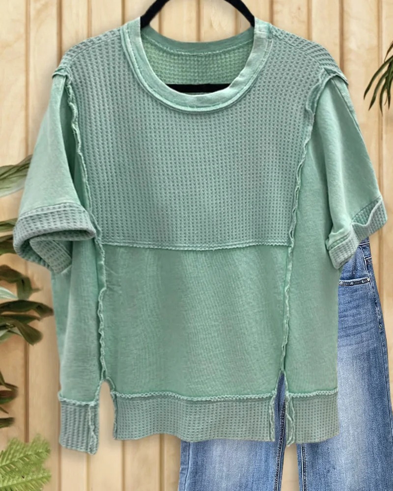 Mint Boutique Waffle Patchwork Cozy Round Neck Solid Color T-Shirt