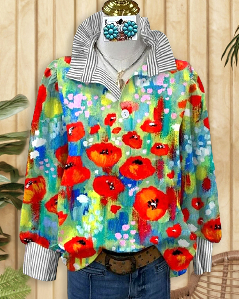 Colorful blouse with watercolor floral print patchwork, perfect for casual or artistic looks.